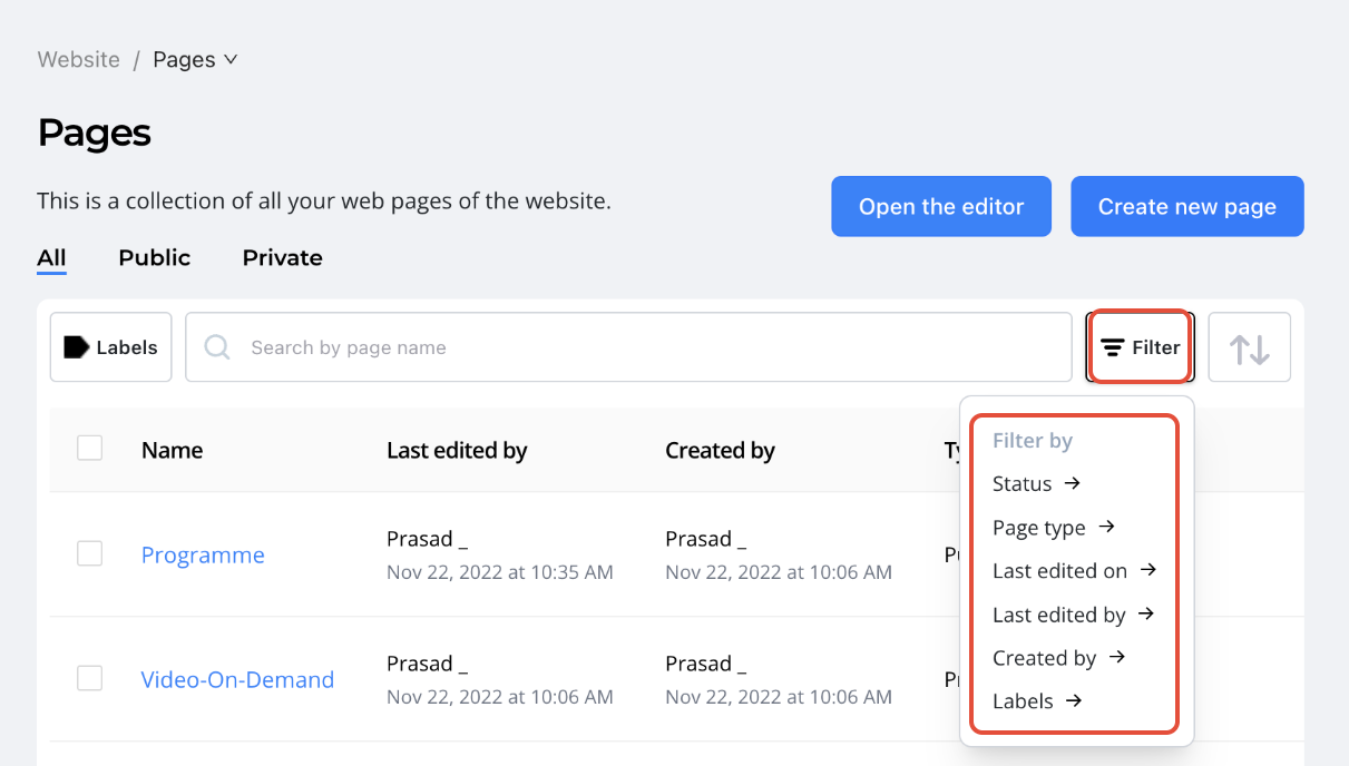 - Last edited by: As a collaborative tool, we display which admin user made changes to a certain page in the page listing. Users can use this attribute filter pages. They can return to the pages they started working on by filtering with Last edited by.