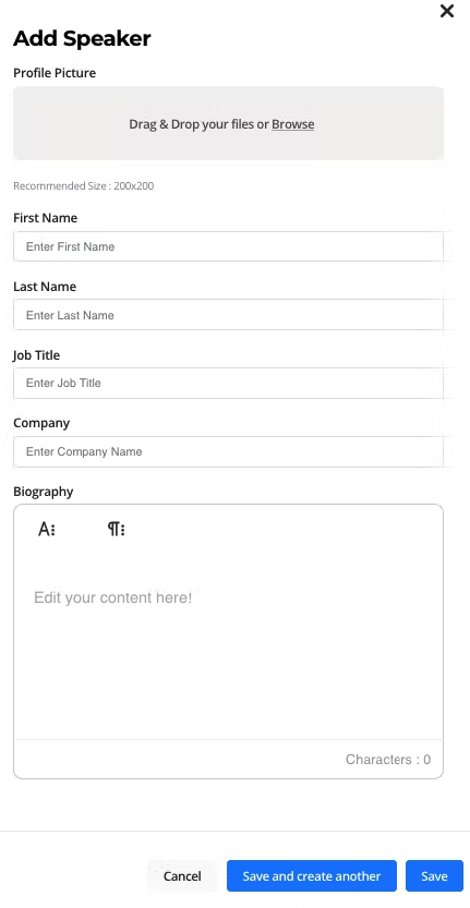 We recommend creating the Speaker's information first so that you can simply pick up the speakers to add to all sessions later.
