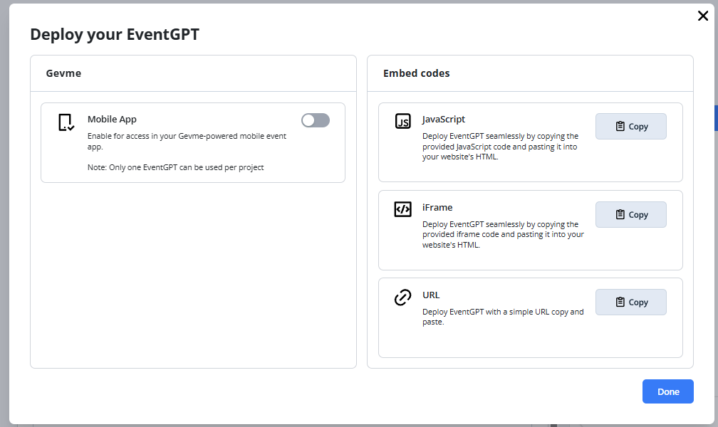 After creating EventGPT, it must be deployed to make it accessible to attendees.